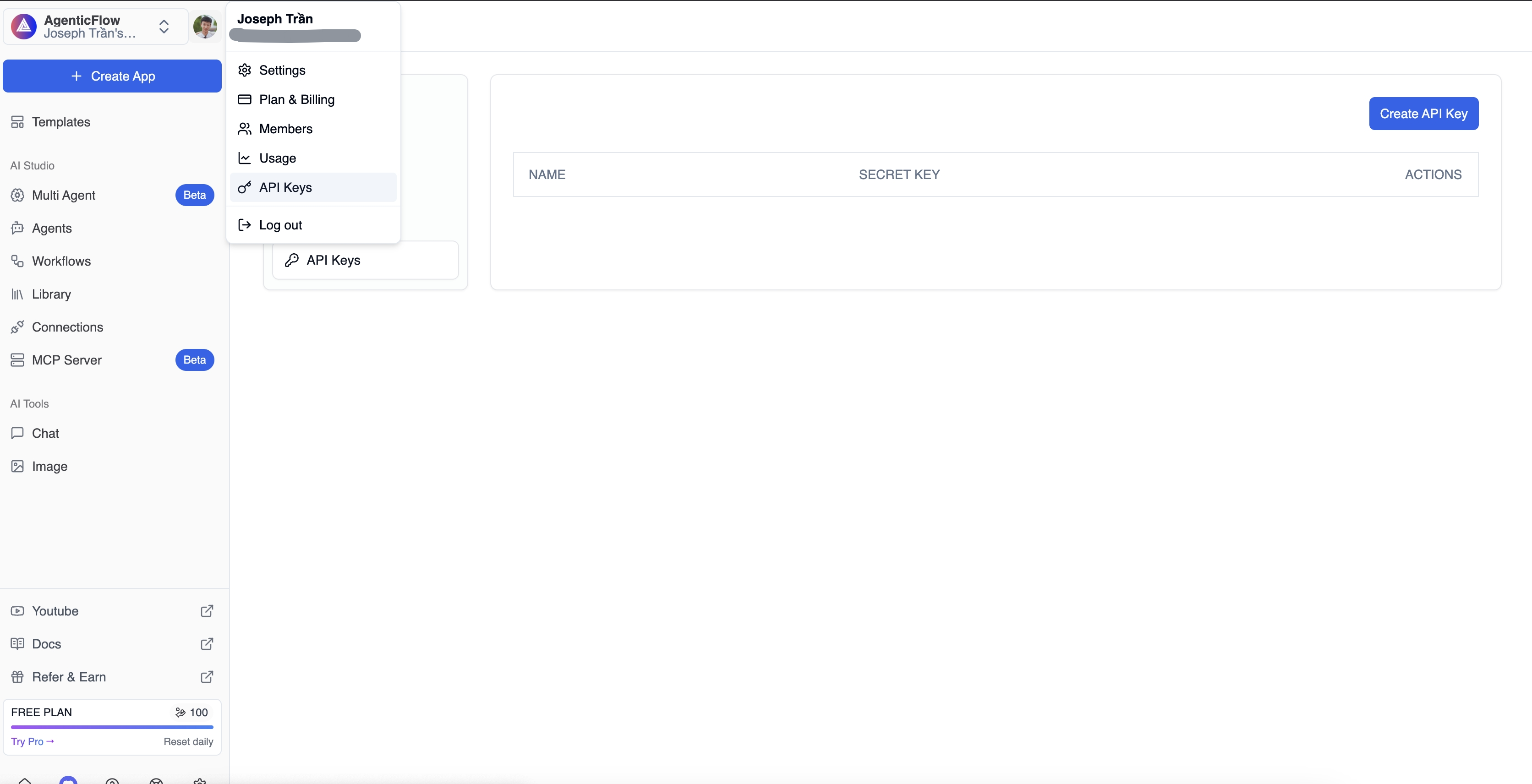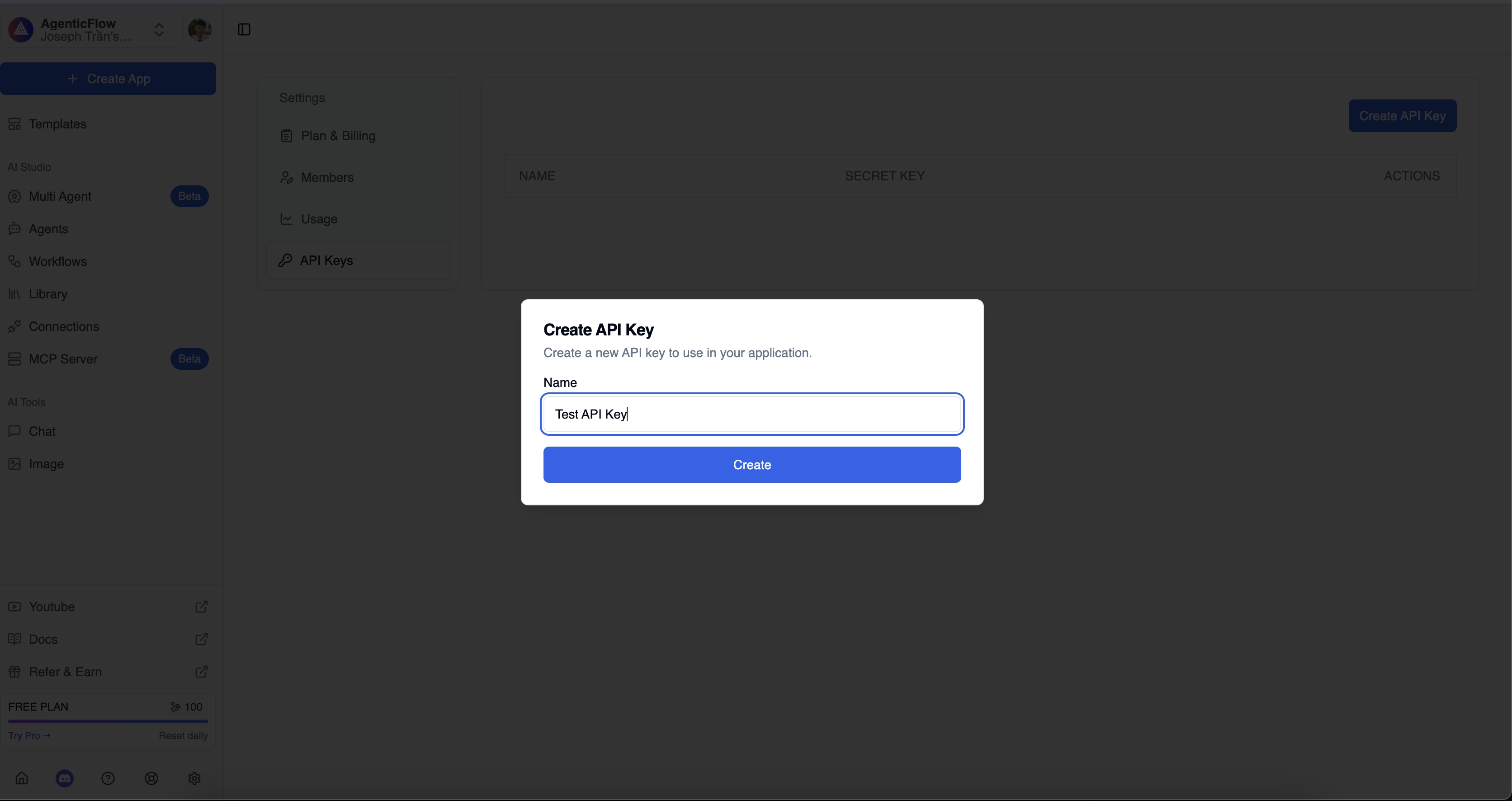 1. **Login and Navigate**: Login to <https://agenticflow.ai> and go to the API Keys page (Click Avatar -> API Keys).